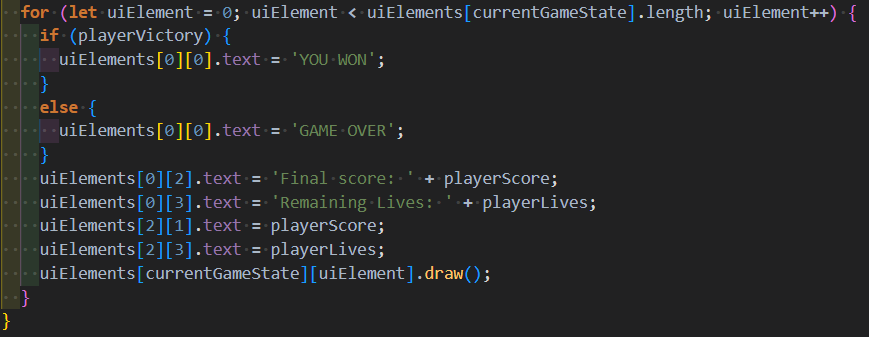 Doelstelling | De 2D array word gebruikt om UI elementen op te roepen die voldoen aan de index van de eerste array.![]() Hieronder is te zien dat elk uiElement van array uiElements gedrawt wordt, als het currentGameStates cijfer hetzelfde cijfer is als de index van de array waar de uiElement zich in bevind. uiElements[currentGameState][uiElement].draw(); ![]() |