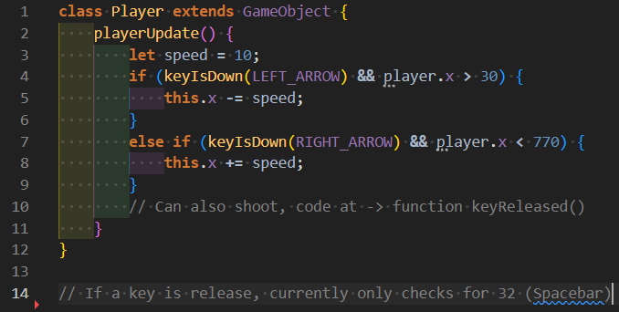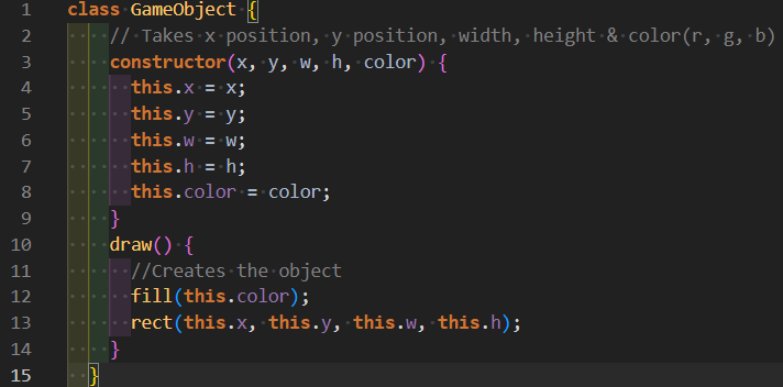 Doelstelling | Elk object in m’n spel is een rechthoek/vierkant, daarom heb ik een GameObject class aangemaakt dat deze vormen maakt. Er zijn child-classes die van deze GameObject class inherit-en. Hieronder is te zien dat er een constructor gebruikt word om attributen te initialiseren. ![]() Hieronder is te zien dat de class ‘Player’ inherit van de class ‘GameObject’ met het gebruik van de functie extends. ![]() |